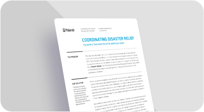 100 Hamilton Ave, Suite 300 [email protected] Palo Alto, California 94301 +1 650 847 8677 COORDINATING DISASTER RELIEF PALANTIR & TEAM RUBICON AFTER HURRICANE SANDY THE PROBLEM After any natural disaster, there is a critical period of time between the disaster itself and the arrival of state-supported aid. Hurricane Sandy struck the Eastern Seaboard in October 2012. Team Rubicon, a disaster response organization composed of military veterans, filled this gap by serving as the first national non-profit organization to deploy into affected areas. Using Palantir Gotham, Team Rubicon deployed Veteran Emergency Response Teams (VERTs) to provide necessary supplies, clear transportation routes, and coordinate over 10,000 spontaneous volunteers. OUR SOLUTION Palantir engineers embedded onsite at Team Rubicon’s command center, partnering with team “The Palantir software leaders to develop an application that enabled volunteers to submit requests for assistance acts as a force multiplier. through web-enabled mobile devices. Within days, volunteers on the ground were using iPads The software addresses and smart phones to file requests for water, medical supplies, and home repairs that were a common problem in aggregated and analyzed as part of the broader operation. Volunteers also used the devices to dispatching crews for disaster relief: lack of real- capture photos of storm damage that were entered into Palantir as media objects and used to time communication.” inform response planning. -Ford Sypher, Team Rubicon Regional Director Back at the command center, analysts used Palantir to maintain situational awareness across all response activities. Coordinators tracked volunteer progress and dispatched additional support as needed. Palantir integrated data sources provided by other organizations, including information on fuel availability, power grids, and available medical clinics. Volunteers on the ground accessed this information in Palantir and relayed the information to affected individuals. Using Palantir’s Map application, dispatchers could visualize where volunteers were located in relation to damaged houses and redirect volunteer groups to areas of highest demand and need. IMPACT & RESULTS In a single day, our Using Palantir, analysts Team Rubicon used Palantir engineers developed a plug- at the command center in the field to coordinate in for volunteers to collect monitored efforts and more than 10,000 requests for assistance in dispatched volunteers to spontaneous volunteers real time using phones and areas of greatest need. for relief efforts. iPads.