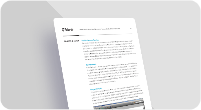Palantir Health: Maximizing Data Assets to Improve Quality, Risk, and Compliance 05 PALANTIR IN ACTION Provider Network Planning The recent transition to value-based care requires more intelligent and data-driven provider monitoring and contracting. To accomplish this, Palantir fuses financial information, health quality metrics, and claims data to create rich, comprehensive views of provider performance. Executive-level dashboards deliver dynamic, real-time insight across all network providers, filtered by health quality scores, cost allocation, and cohort comparison to diagnose and address network deficiencies for any specialty or service. Organizations leverage these same metrics to drive the provider contracting and resourcing process. Risk Adjustment Risk adjustment is increasingly important due to changes in reimbursement methodology for Part C plans and the introduction of state exchanges for individual plans. It is imperative that members are appropriately classified and scored to prevent untenable financial risk. With Palantir, analysts can surface anomalies where CMS or HHS risk scores are incongruent with the actual risk status of individual members. Palantir allows analysts to visualize these connections and patterns, triage recommendations, and take next steps—whether that is adjusting claims or reaching out to providers. Program Integrity Palantir is a powerful analytical platform for detecting fraud, waste, and abuse across all stages of the program integrity lifecycle, from provider/beneficiary enrollment to criminal prosecution. Palantir integrates all data into a single environment to support lead generation, triage, investigation, and action, allowing analysts to build out complex networks of fraudulent provider groups and identify emerging fraud schemes with unprecedented speed. Using Palantir, analysts can rapidly build out fraud networks.