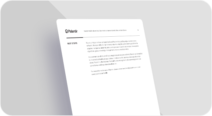 Palantir Health: Maximizing Data Assets to Improve Quality, Risk, and Compliance 06 NEXT STEPS We are a mission-driven company dedicated to providing cutting-edge, transformative software. We solve difficult, high-stakes problems using the world’s leading platform for adaptive intelligence, data integration, next-generation search and analysis, investigative algorithms, global knowledge management, and secure collaboration. As a commercial-off-the-shelf data integration and analysis platform, Palantir can be applied to innumerable healthcare applications. In addition to the business challenges described above, Palantir is also deployed for mobile case management, disease management and surveillance, and drug interaction detection. For more information about Palantir, please contact us at [email protected] or visit www.palantir.com/health.